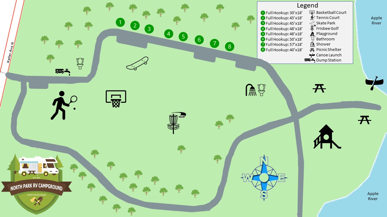 North Park RV Campground is located in the heart of Amery, Wisconsin along the beautiful Apple River. The campground is just north of the Amery downtown area on Wisconsin Highway 46 opposite of the North Twin Lake Boat Landing.